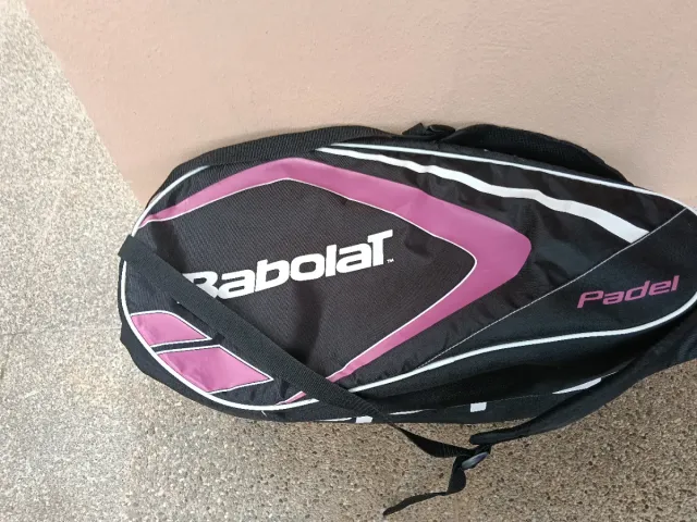 Bolsa de pádel de la marca Babolat. - Color negro con detalles en morado y blanco. - Logo de Babolat en grande. - Inscripción Padel en un lateral.