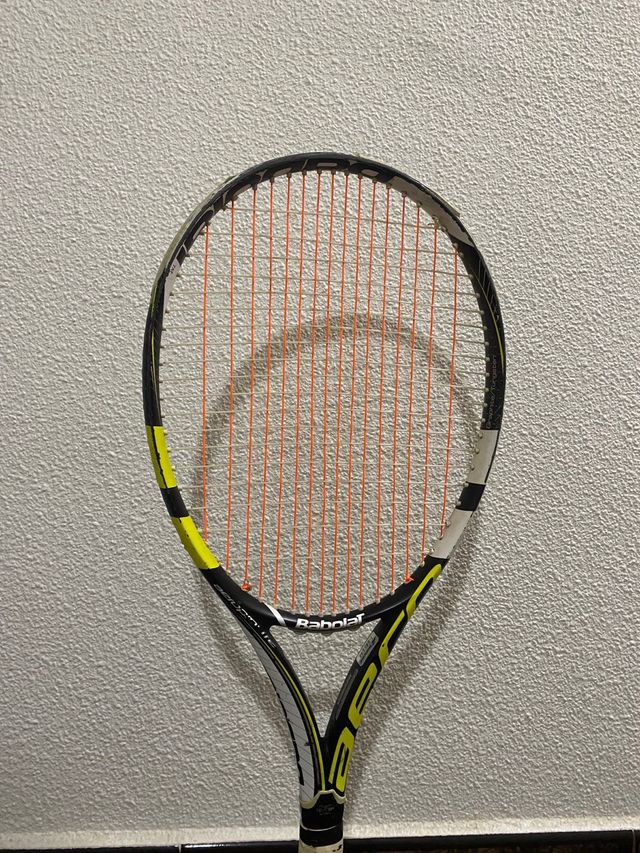 Raqueta de tenis Babolat Pure Aero Junior. - Diseño deportivo en negro, amarillo y blanco. - 260g - Marca Babolat visible en el marco.