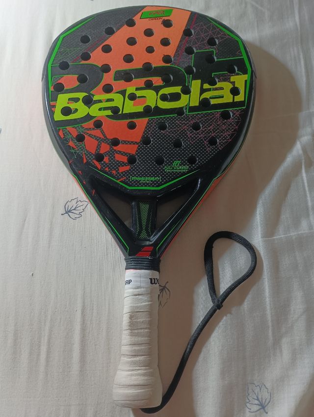 Detalles del productoQué decir de esta pala. Todo un año jugando con ella y da la sensación de poder seguir 2 años más, no se emblandece. Tiene los típicos roces del juego en el borde de arriba, pero las caras impolutas. Tiene una reparación, como se ve en las fotos. La vendo porque tengo otra nueva y veo que esta la usaría poco y me da lástima desaprovecharla. Pesa 395gr tal y como está en las fotos, con un grip y medio más enrollado en la base.