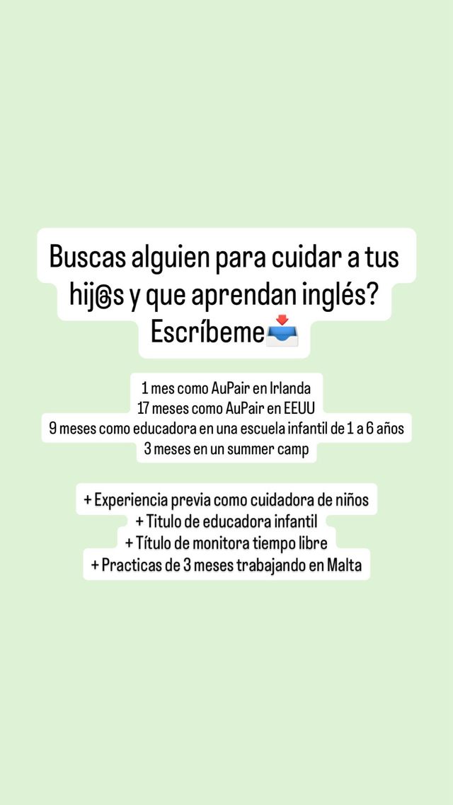 Detalles del productoSi buscas a una persona de confianza para que cuide a tus hijos y que aprendas inglés de forma natural conversando, escríbeme.