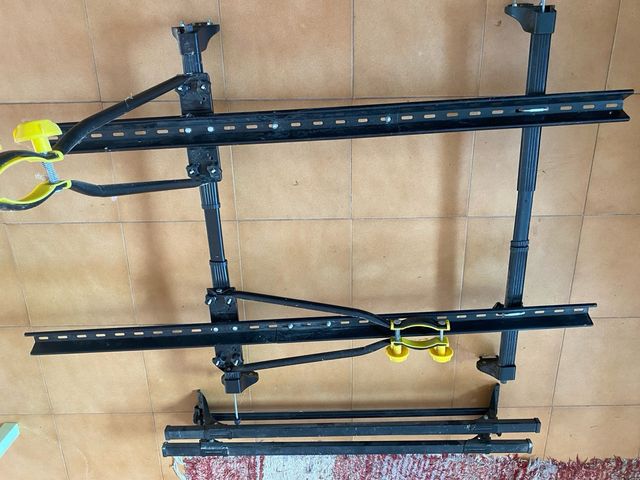 Baca de coche para transportar equipaje o bicicletas. - Barras de metal negras. - Soportes ajustables con pinzas amarillas.