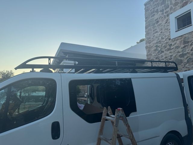 Baca para Renault Trafic modelo L2. Fabricada en metal negro. - Barras de techo. - Diseño robusto. -rodillo de carga -escalera de acceso al techo