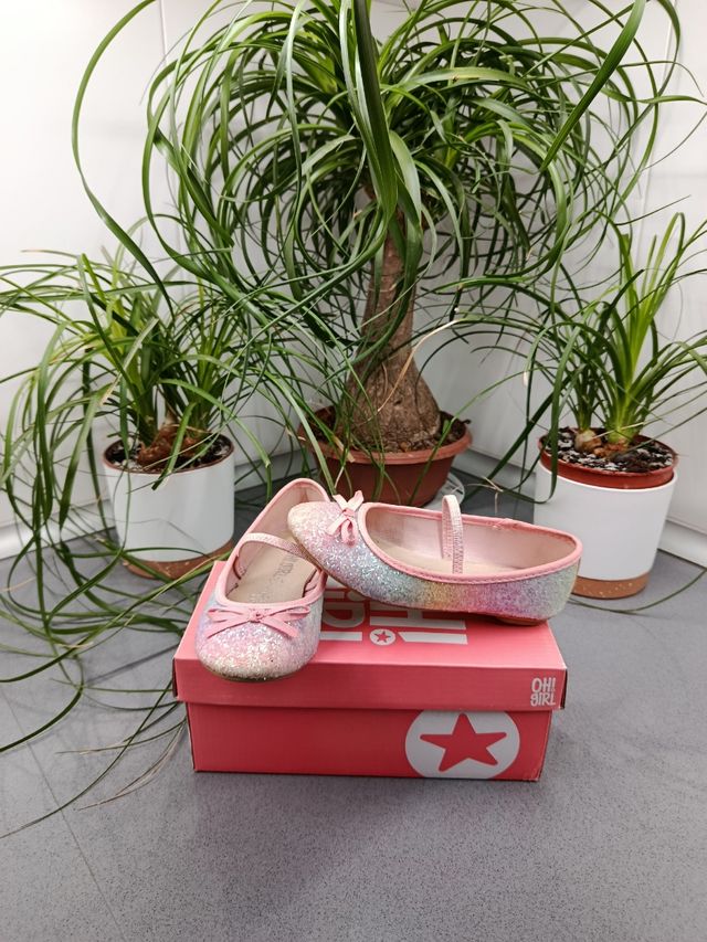 Detalles del productoPreciosas bailarinas para niña en talla 28. Tienen un diseño brillante con efecto arcoíris y un lazo en la puntera.