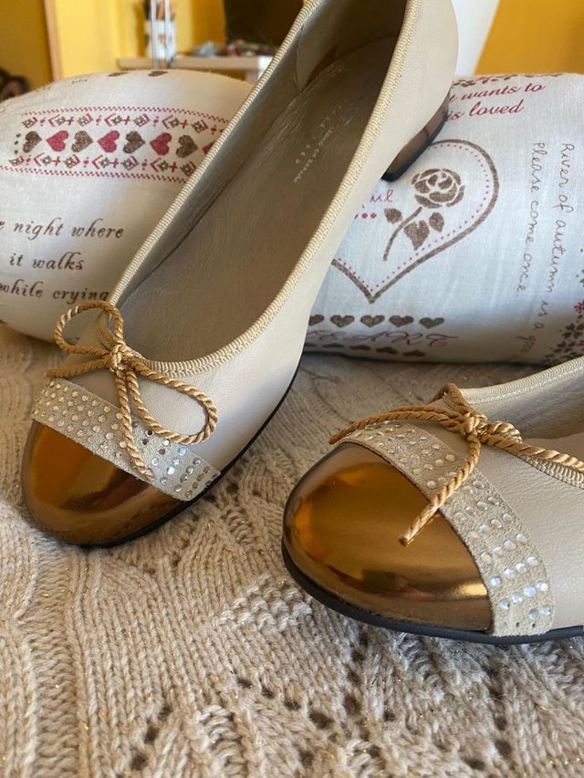 Bailarinas nuevas sin estrenar. Talla 40. Color beige, con la punta de color dorado y brillantes.