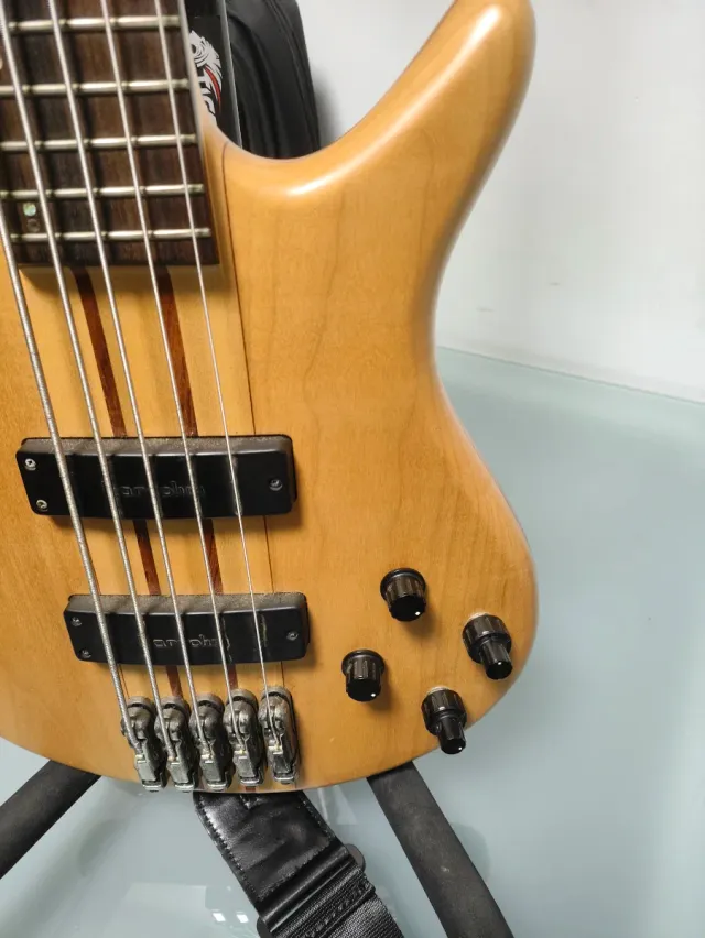 Detalles del productoBajo eléctrico de 5 cuerdas con un acabado en madera natural.