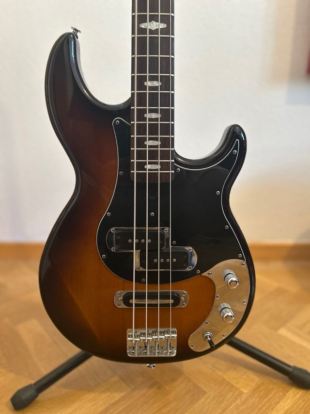 - Mástil de 5 piezas de Maple y Caoba. Diapasón de Rosewood.