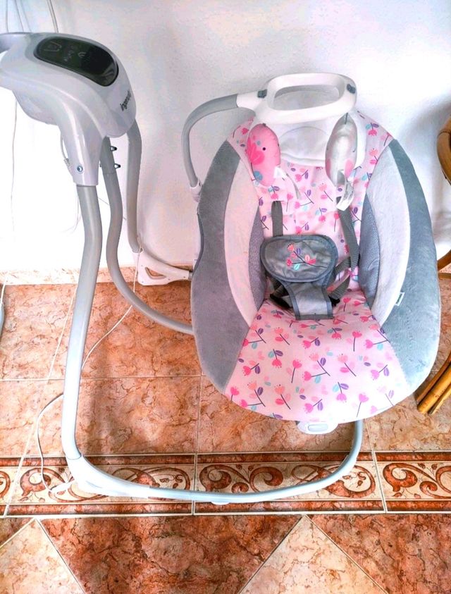 Detalles del productoColumpio balancín musical para bebé Ingenuity en color rosa y blanco. Dispone de 6 velocidades, varias canciones y sonidos de naturaleza, vibración, arnés de 5 puntos, temporizador... tiene más extras que mi coche jeje.