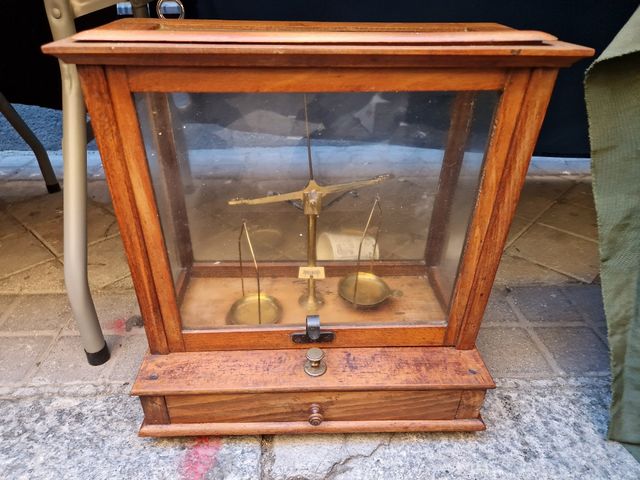 Balanza de precisión antigua con estructura de madera y cristal. - Bandejas de latón. - Mecanismo de pesaje visible. - Cajón inferior con tirador.