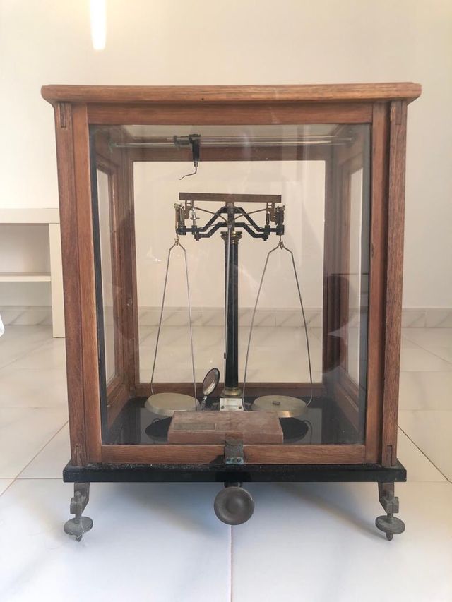 Detalles del productoFantástica y antigua balanza de precisión o farmacia en urna de cristal, original de principios del siglo XX y en excelente estado de conservación. Medidas 50x38x27,5 cm. La balanza y la urna son totalmente originales de época: la balanza conserva todas sus partes y componentes de metal en magníficas condiciones. El juego de pesas que acompaña a este artículo está formado por piezas de metal plateado guardadas en un estuche de madera de haya. El juego está completo y se presenta un kit de micropesas.