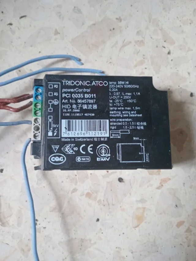 Balasto electrónico Tridonic ATCO para lámparas de 35W HI. - Modelo: PCI 0035 B011 - Tensión: 220-240V 50/60Hz - Corriente: 0,20A - Fabricado en Suiza