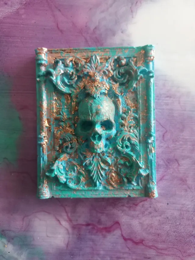 Baldosa de escayola con un diseño detallado. - Motivo central de calavera. - Decoración ornamentada en relieve. - Acabado en color turquesa y dorado.