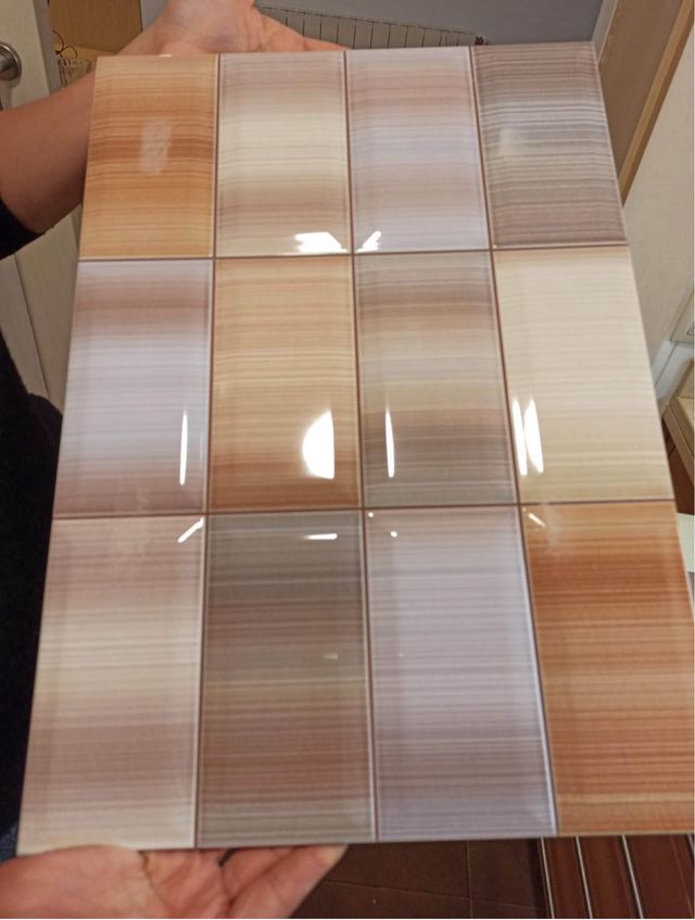 Detalles del productoBaldosa tipo mosaico con un diseño de rayas degradadas en tonos marrones y beige. Aporta un toque moderno y elegante a cualquier espacio.