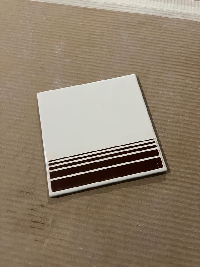 Detalles del productoPack de 14 baldosas de cerámica con diseño de rayas marrones sobre fondo blanco. Cada baldosa mide 15x15cm.