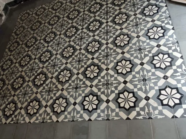 Detalles del productoBaldosas hidráulicas con un diseño geométrico y floral en tonos grises, blanco y negro. Ideales para dar un toque vintage a cualquier espacio.