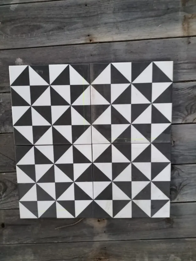 Detalles del productoConjunto de baldosas para suelo con un diseño geométrico de triángulos en blanco y negro.