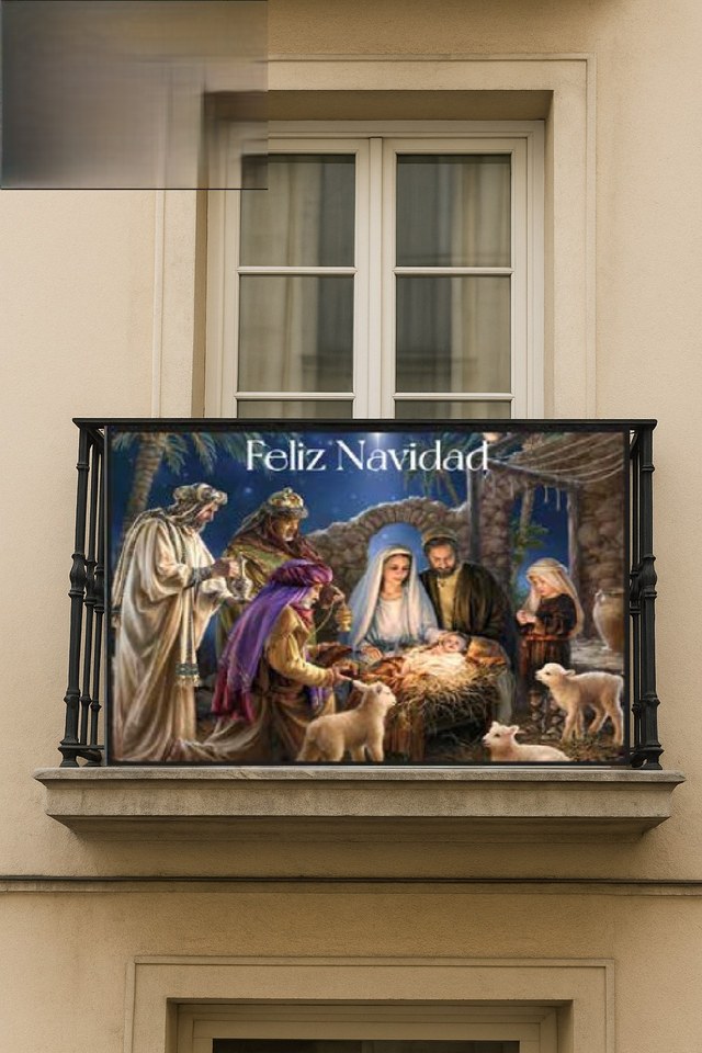 Decoración para balcón con escena de Belén. - Diseño navideño. - Imagen de Feliz Navidad con figuras del nacimiento.