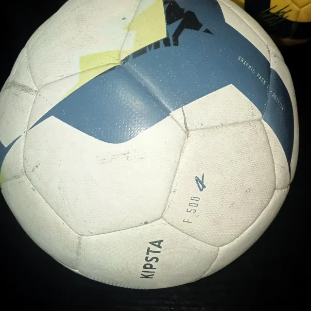 Balón de fútbol - Color blanco con detalles en azul y amarillo.