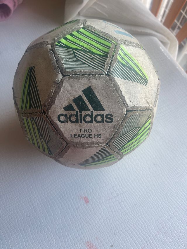 Balón de fútbol Adidas. - Diseño con paneles. - Detalles en verde y gris.