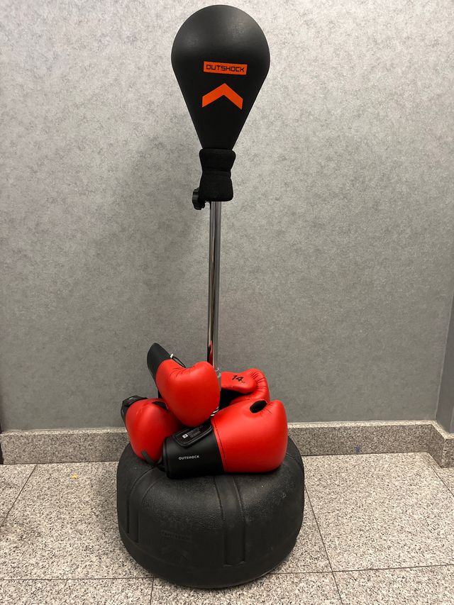 Set de entrenamiento de boxeo con balón y guantes. - Balón de boxeo negro con base. - Dos guantes de boxeo rojos, talla 14oz. y 8oz.