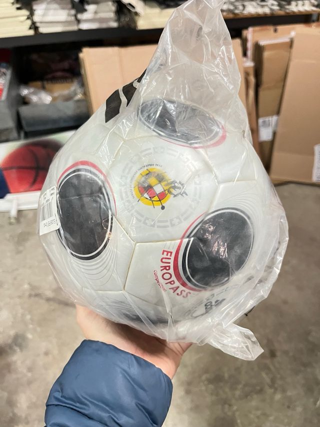 Balón de fútbol Adidas Europass, diseñado para un alto rendimiento. - Diseño blanco con detalles en negro, rojo y amarillo. - Logotipo de Europass visible.
