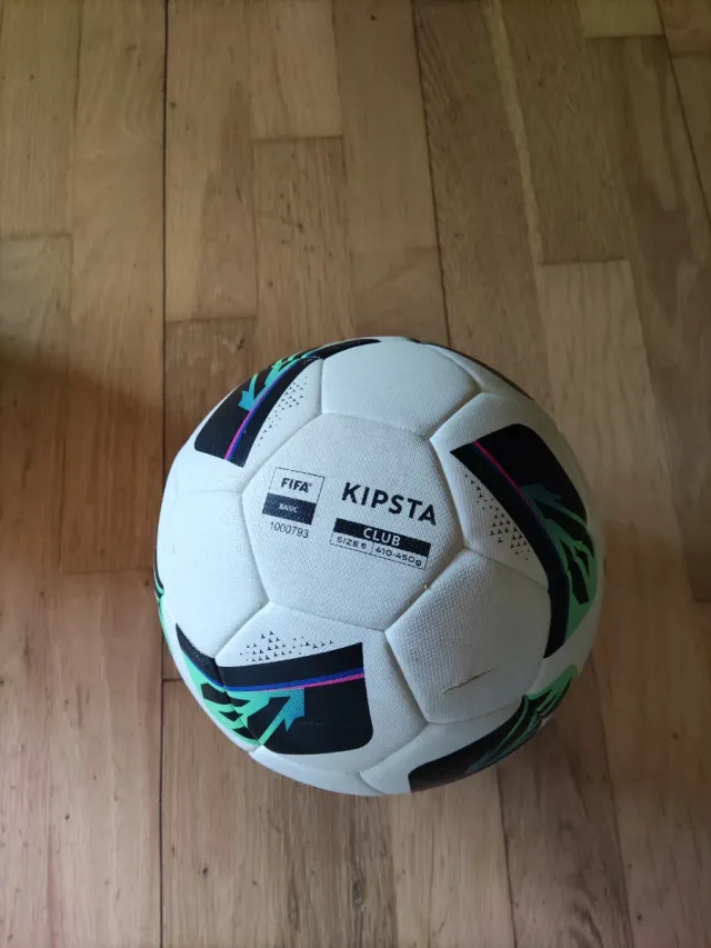 Balón de fútbol Kipsta con certificación FIFA Basic. - Diseño blanco con detalles en negro, azul y verde. - Tamaño oficial para club. - Peso entre 410 y 450 gramos.