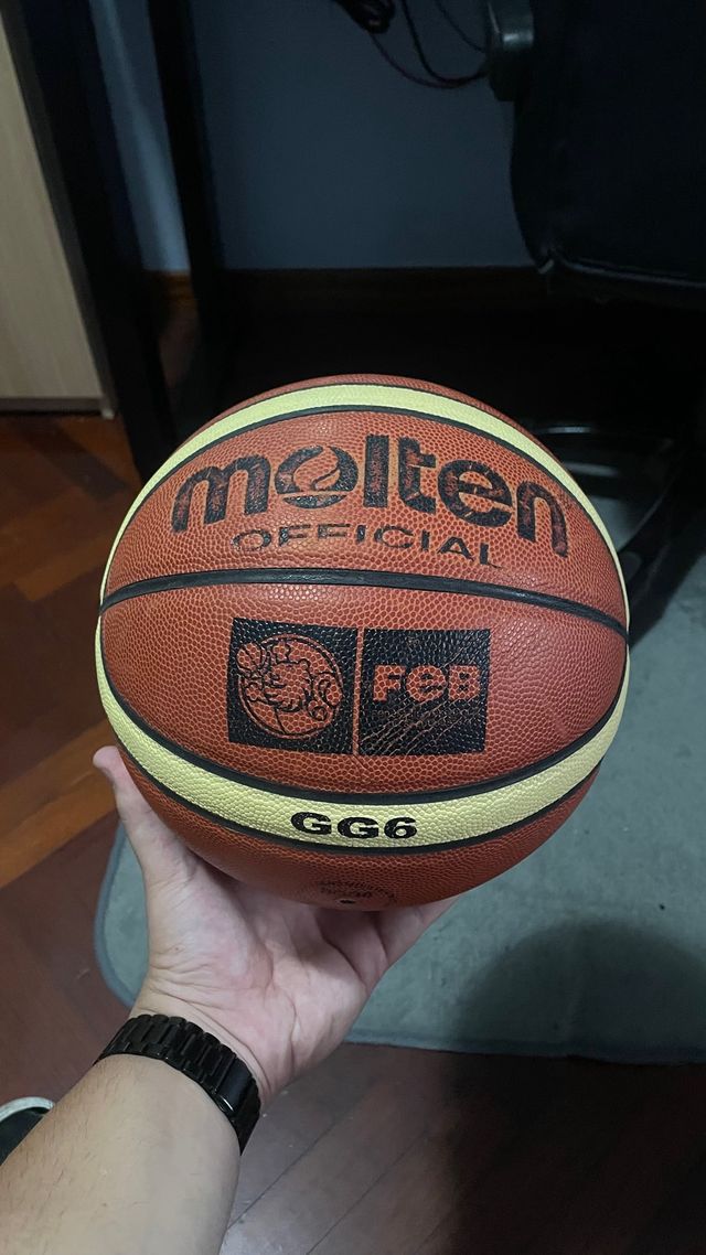 Diseño clásico en cuero sintético de los balones oficiales de la FEB, me tocó en un sorteo de un club que está escrito en su lateral pero no lo uso, es perfecto para jugar en interior y está en un estado muy, muy bueno.