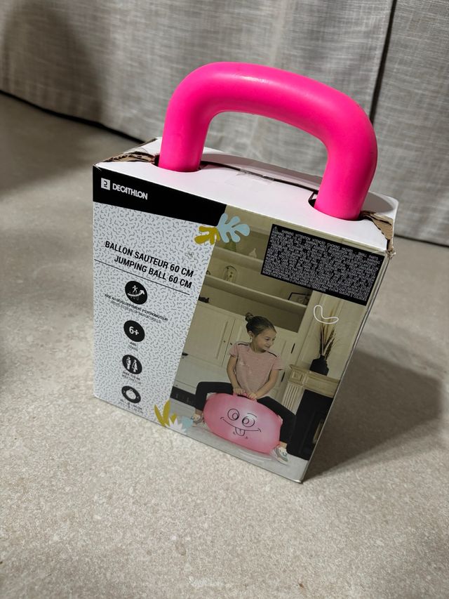 Balón saltador de gimnasia infantil en color rosa. - Diámetro de 60 cm. - Marca: Decathlon. - Edad recomendada: 6+ años.