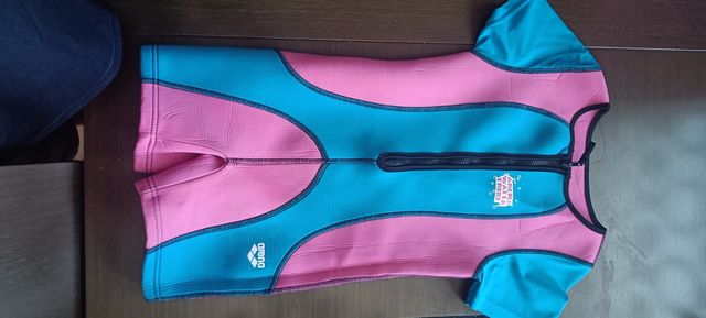 Detalles del productoTraje de baño de neopreno para niña, de la marca Arena. Es de color rosa y azul, con cremallera frontal.