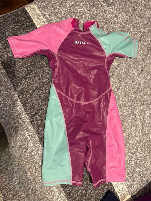 Detalles del productoTraje de baño de neopreno para niña de la marca Nabaiji. Es de color morado, rosa y verde menta.
