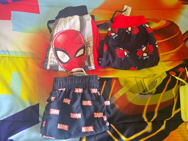 Tres bañadores de Spiderman para niño de 5 años. Están en buen estado. - Tres bañadores cortos. - Con diferentes estampados de Spiderman. - Ideales para la piscina o la playa.