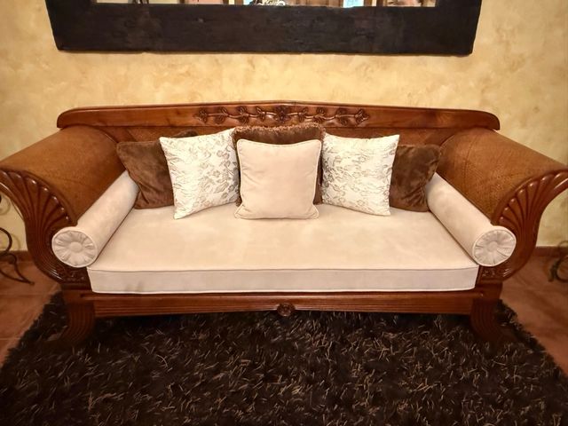 Elegante banca de madera con un diseño clásico y detalles tallados. - Estructura de madera robusta. - Tapicería en tonos neutros. - Acolchado confortable.