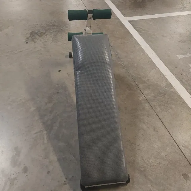 Banco para ejercicios abdominales. - Tapicería gris. - Soportes verdes para tobillos.