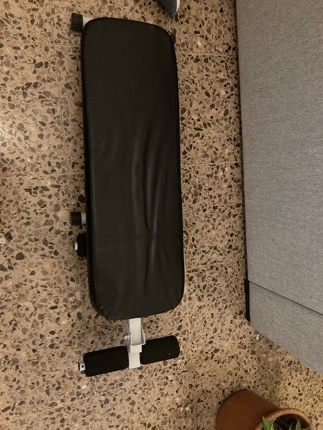Banco para ejercicios de abdominales. - Tapizado negro. - Estructura metálica blanca. - Reposapiés acolchados.
