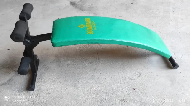 Banco de abdominales con diseño curvo para entrenamientos. - Tapicería verde. - Estructura metálica negra. - Ruedas para tobillos. - Asas acolchadas.