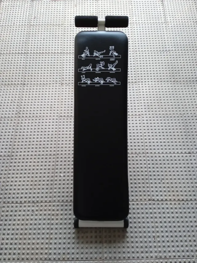 Banco de ejercicios negro con soportes acolchados para tobillos. Incluye guía de ejercicios. - Diseño compacto. - Estructura robusta.