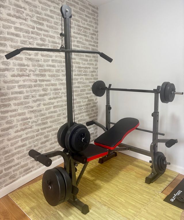 Detalles del productoBanco de ejercicios multifuncional con el que podrás fortalecer múltiples zonas de tu cuerpo, incluye polea, barra y pesas.