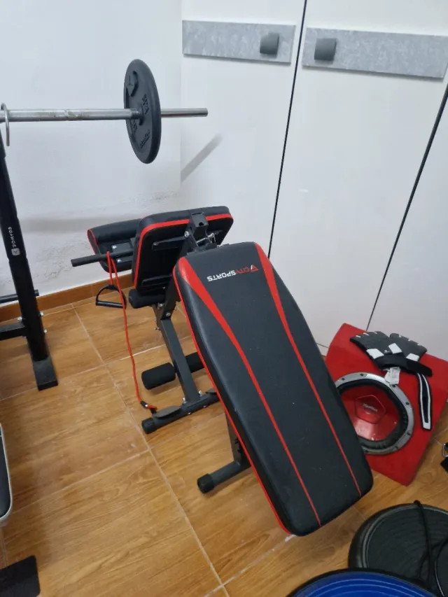 Detalles del productoBanco de gimnasia multifuncional con barra y discos de pesas.