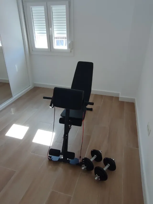Equipo de gimnasio para entrenar en casa. - Banco de pesas con soporte para ejercicios. - Dos mancuernas de 10 kg cada una.