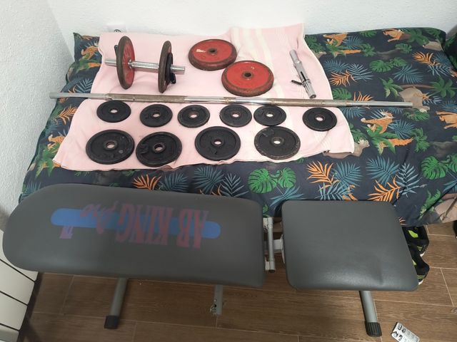 Banco de musculación con 46 kilos en discos. Dos mancuernas y una barra olímpica de 20 kilos.