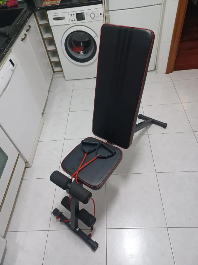 Detalles del productoBanco de musculación con diseño plegable, ideal para entrenar en casa. Incluye bandas de resistencia.