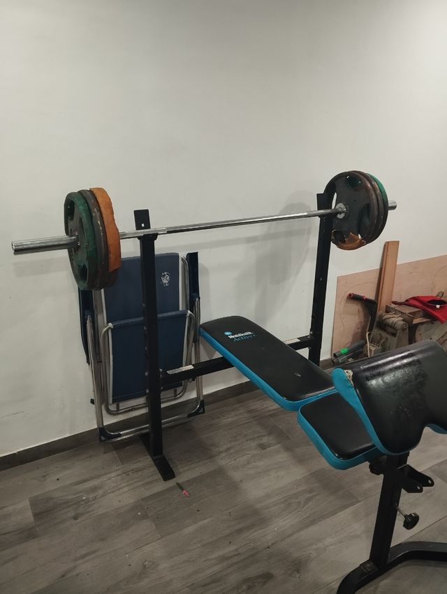 Detalles del productoBanco de pesas para entrenamiento en casa. Incluye barra y discos.