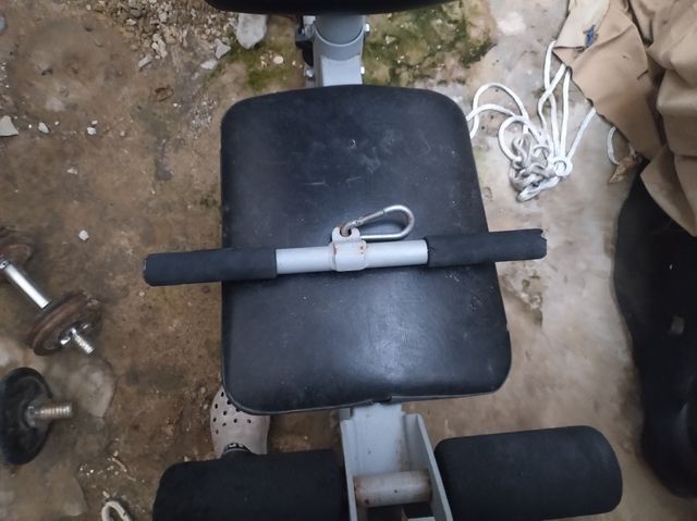 Detalles del productoBanco conde pesas ,con barra larga y 2 pesas de rosca pequeñas,con 95 kilos en discos,y máquina multifuncional con distintos agarres para poder hacer todos los grupos