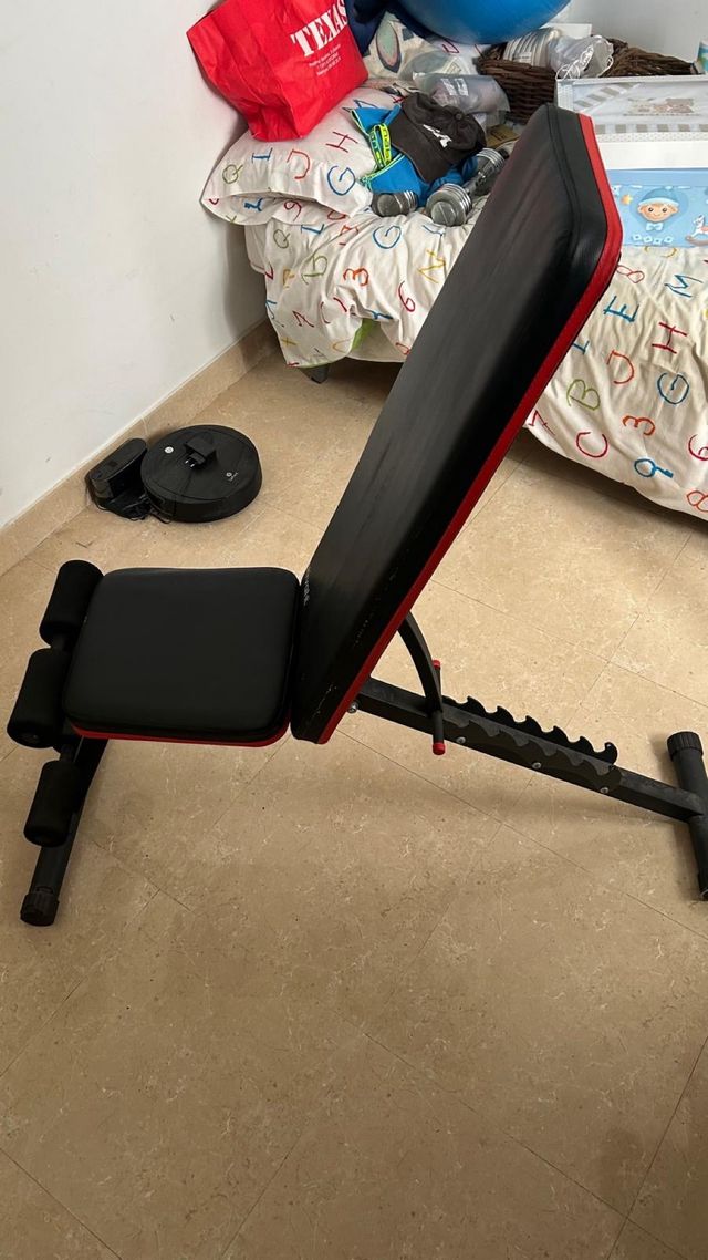 Detalles del productoBanco de pesas con estructura metálica y acolchado en asiento y respaldo.