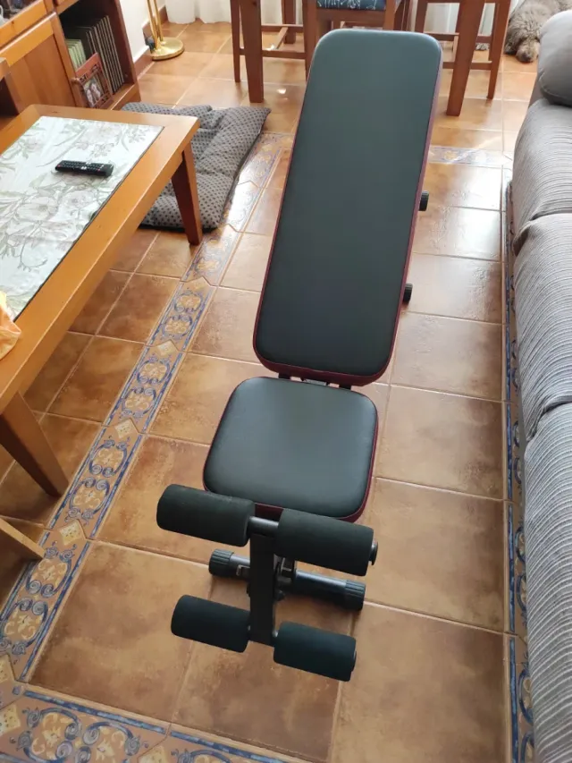 Detalles del productoBanco de pesas con estructura metálica y acolchado.