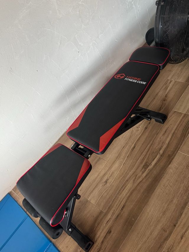 Detalles del productoBanco de entrenamiento versátil para tu rutina de ejercicios en casa. Diseño moderno en negro y rojo.