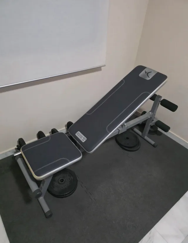 Detalles del productoBanco de entrenamiento ajustable con pesas incluidas. Ideal para rutinas de fuerza en casa.