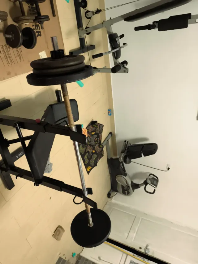 Equipo de gimnasio para entrenar en casa. - Banco de pesas. - Bicicleta estática. - Barras y discos de pesas.