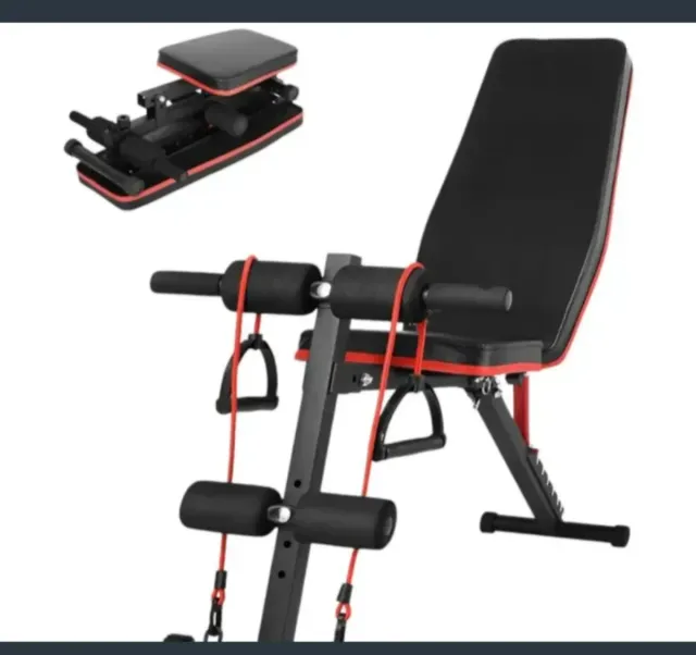 Detalles del productoBanco de pesas multifunción en color negro y rojo. Ideal para entrenamientos en casa.