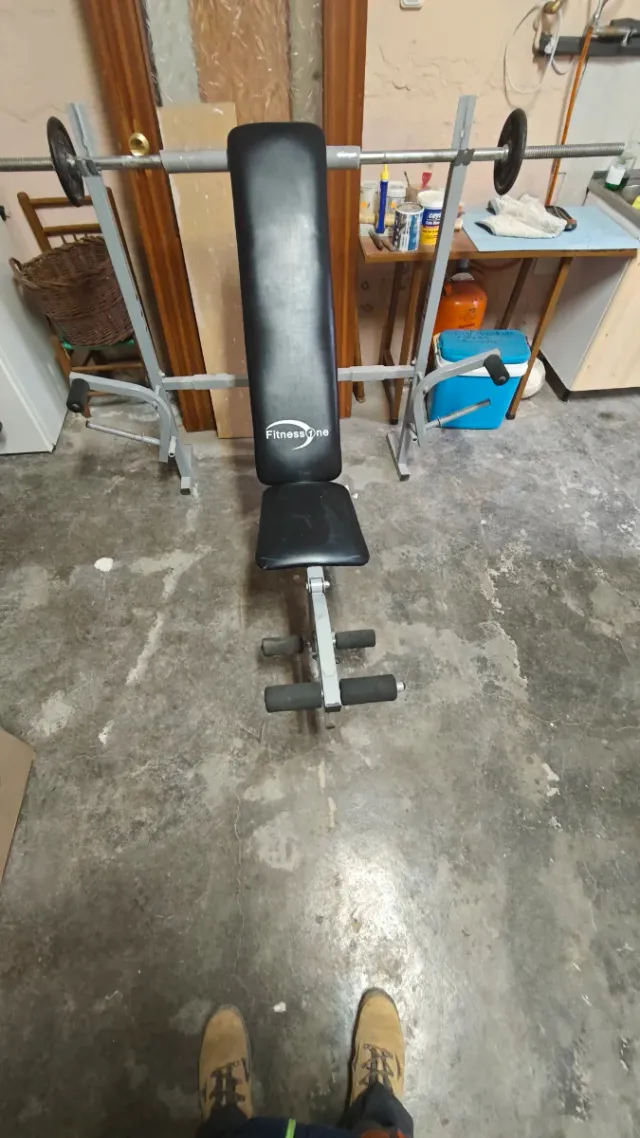 Banco de pesas con barra para entrenar en casa. - Estructura metálica. - Asiento y respaldo acolchados. - Incluye barra.