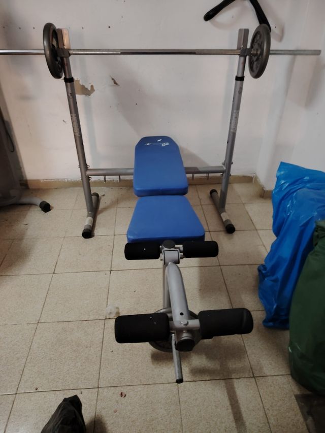 Detalles del productoBanco de pesas con barra para entrenar en casa. Ideal para rutinas de fuerza.